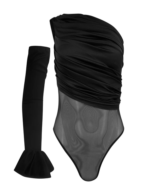 The Kali bodysuit is crafted from a stretch silk charmeuse and a tulle mesh base. Its one-shoulder design is complimented with a detached sleeve for versatility. Gathered pleats and asymmetric cuts effortlessly flatter the body to give a sultry, timeless appeal.