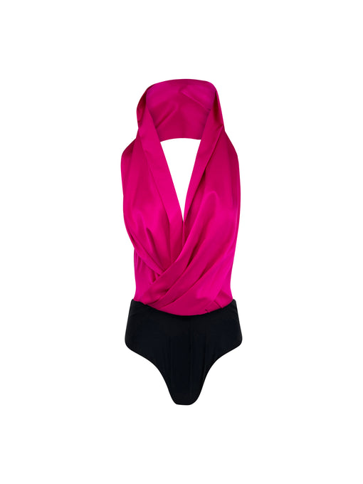 Crafted from a luxurious stretch silk charmeuse, the Sera Bodysuit features a halter style and a multi-way drape that can twist in at least 3 different ways around the body.